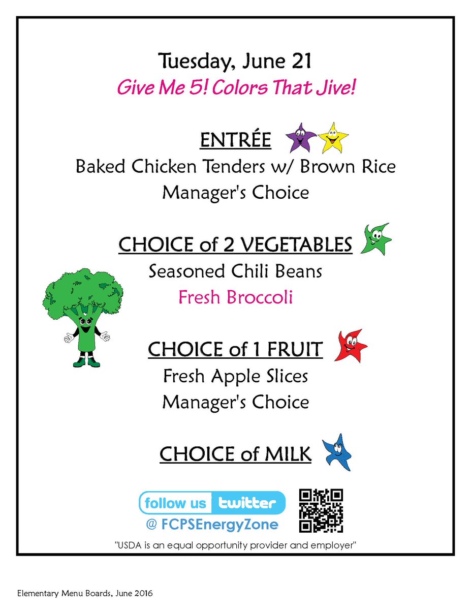 Fcps Energy Zone On Twitter Elementary School Lunch Menu For Tuesday June 21th 2016 Fcpsnews Https T Co Wksfiqxiqp Twitter